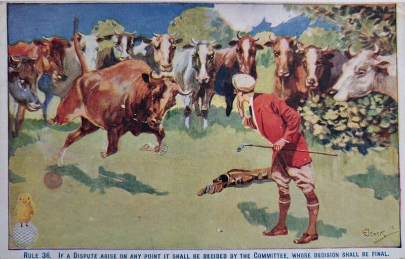 Used post card, showing a cartoon linked to "Rule 36. If a dispute arise at any point, it shall be decided by the committee, whose decision is final"; image by Elcock; message to the rear; in good condition; postmark of 1913; c.9cm by 14cm
