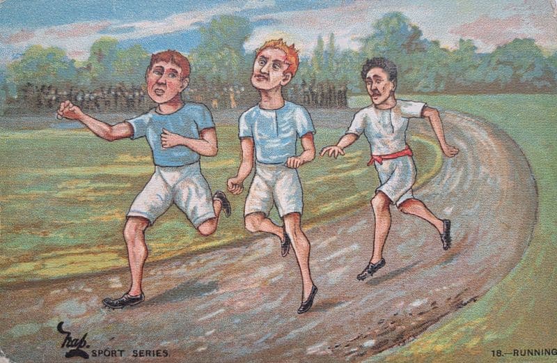 Card from the Nap Sports Series - this one is No. 18 "Running"; 9cm by 14cm; in fairly good condition, with slight wear to one corner; picture shows three gentlemen in an early track race; postmark to rear is August 29th, 1907