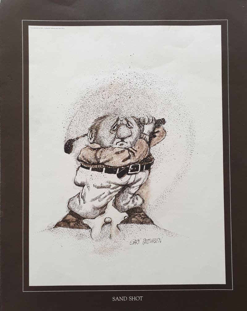 Cartoon print by the renowned American artist Gary Patterson; overall size is 51cm by 41cm - image is approximately 42cm by 32cm; portrait; brown border with cream edging and writing; titled "Sand Shot"; in good condition.