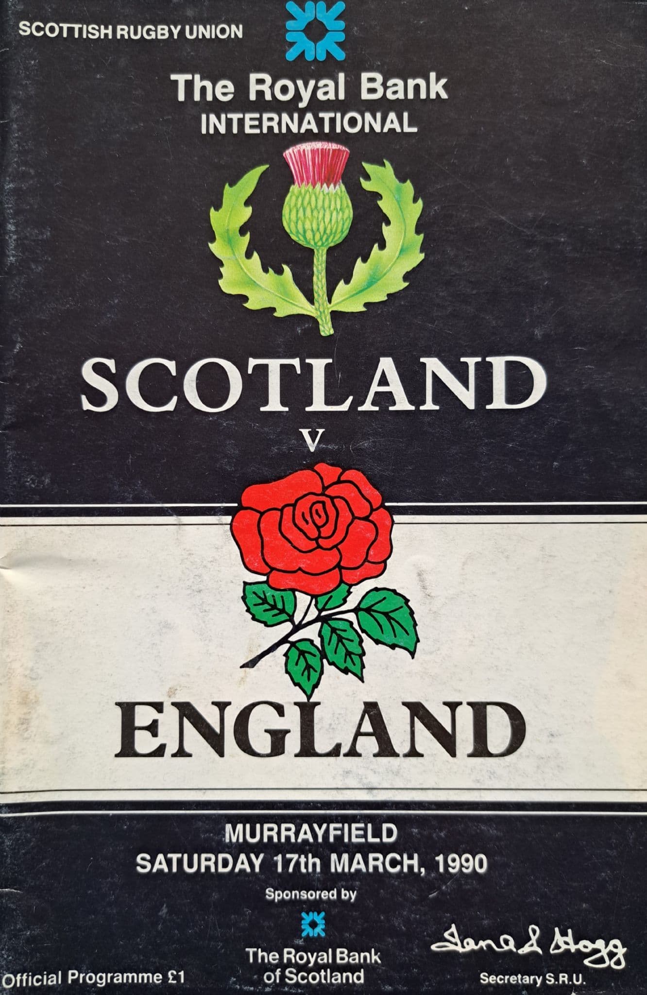 Programme for the Five Nations match, played at Murrayfield on Saturday 17th March 1990; programme is in fairly good condition with slight marking to the front cover; Scotland won 13-7, on their way to a Grand Slam