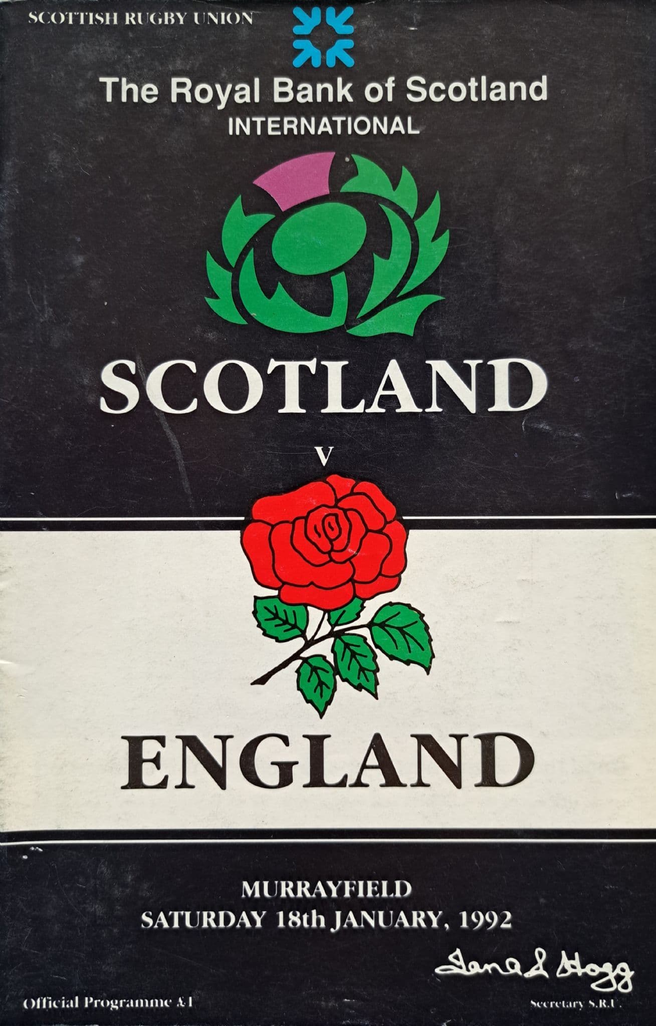 Programme for the Five Nations match, played at Murrayfield on Saturday 18th January, 1992; programme is in fairly good condition with slight marking to the front cover; England won 25-7 to retain the Calcutta Cup