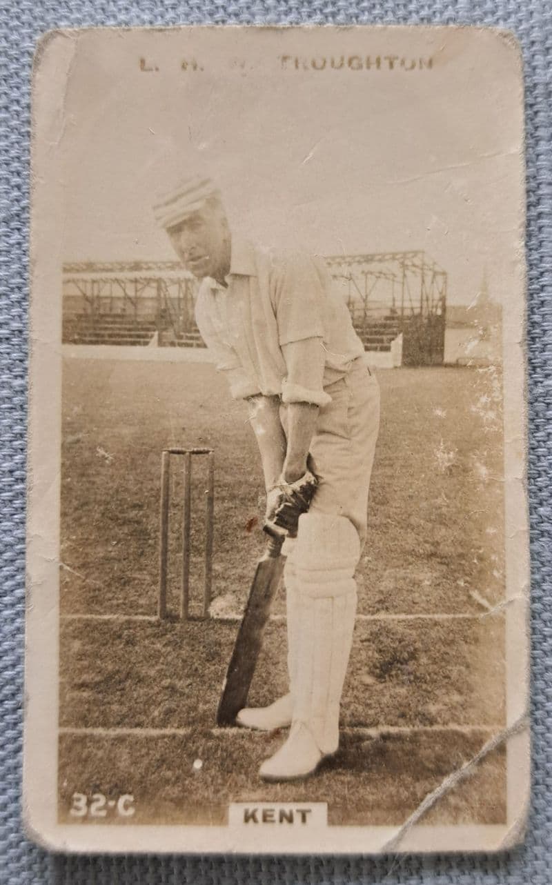 Card 32.C from the "Series of Cricketers", produced by Godfrey Phillips in 1924; card features LHW Troughton of Kent; one of the brown backed series; in fair condition with a small corner crease and rubbed corners