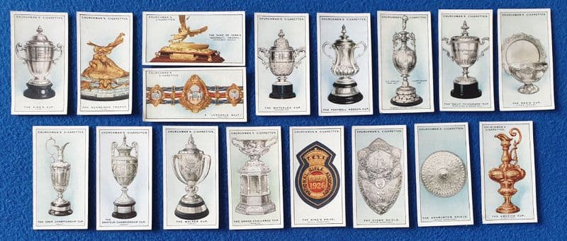 Seventeen cigarette cards from the WA Churchman "Sporting Trophies" set, given away in 1927; colour photos, linked to a variety of different sports; mostly in good condition; cards are 1, 2, 3, 4, 5, 6, 7, 15, 16, 17, 18, 20, 21, 22, 23 (writing to rear), 24, 25
