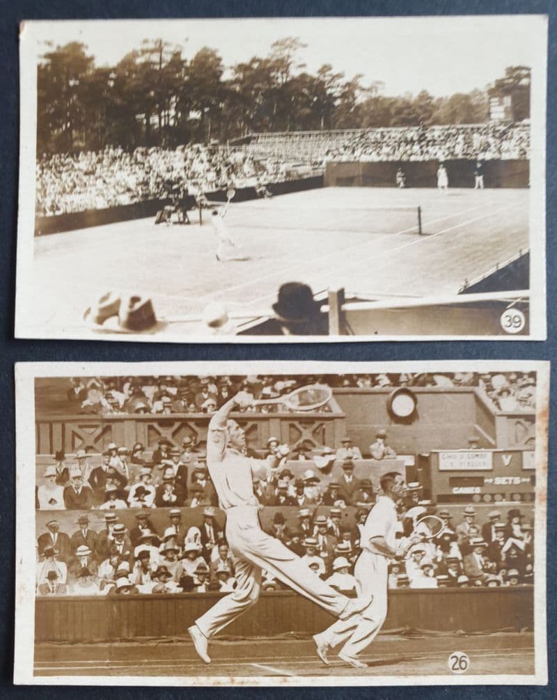 Two cards from the fifty card "Sports" set - produced by R&J Hill in 1934; numbers 28 (men's doubles final at Wimbledon) and 39 (Miss Bennett v Miss Akhurst); in good condition; numbered front and back - which was unusual for cigarette cards of the period