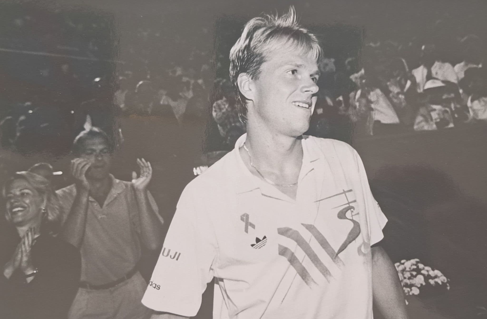 Small black and white press photo from a recently acquired Professional Sport collection; showing Stefan Edberg just after he had won the US Open in 1992; landscape; 12.5cm x 19cm