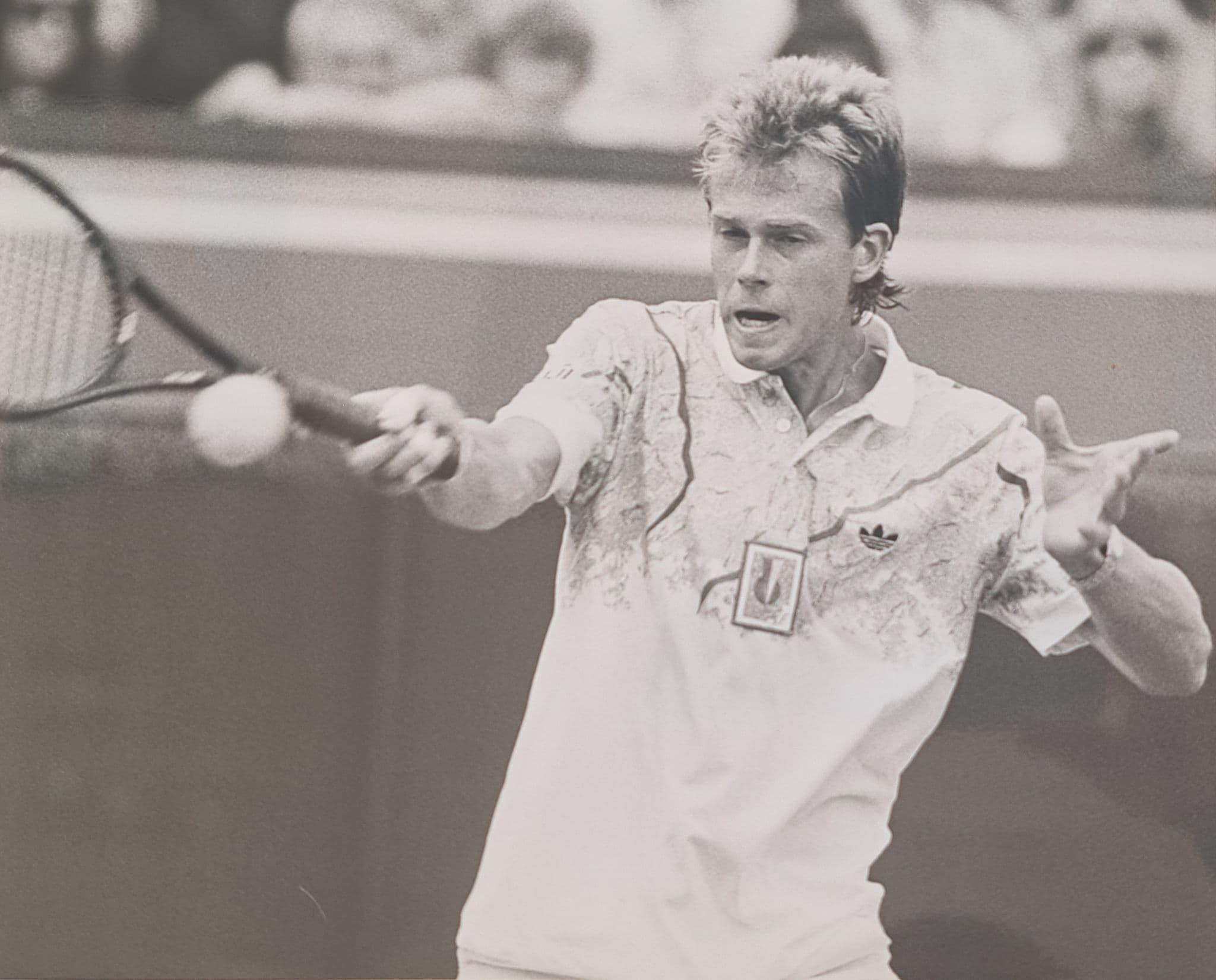 Black and white press photo showing Stefan Edberg hitting a forehand - the adidas shirt dates this to 1990; landscape; c. 19.5cm x 24.5cm; Bob Thomas information to the rear