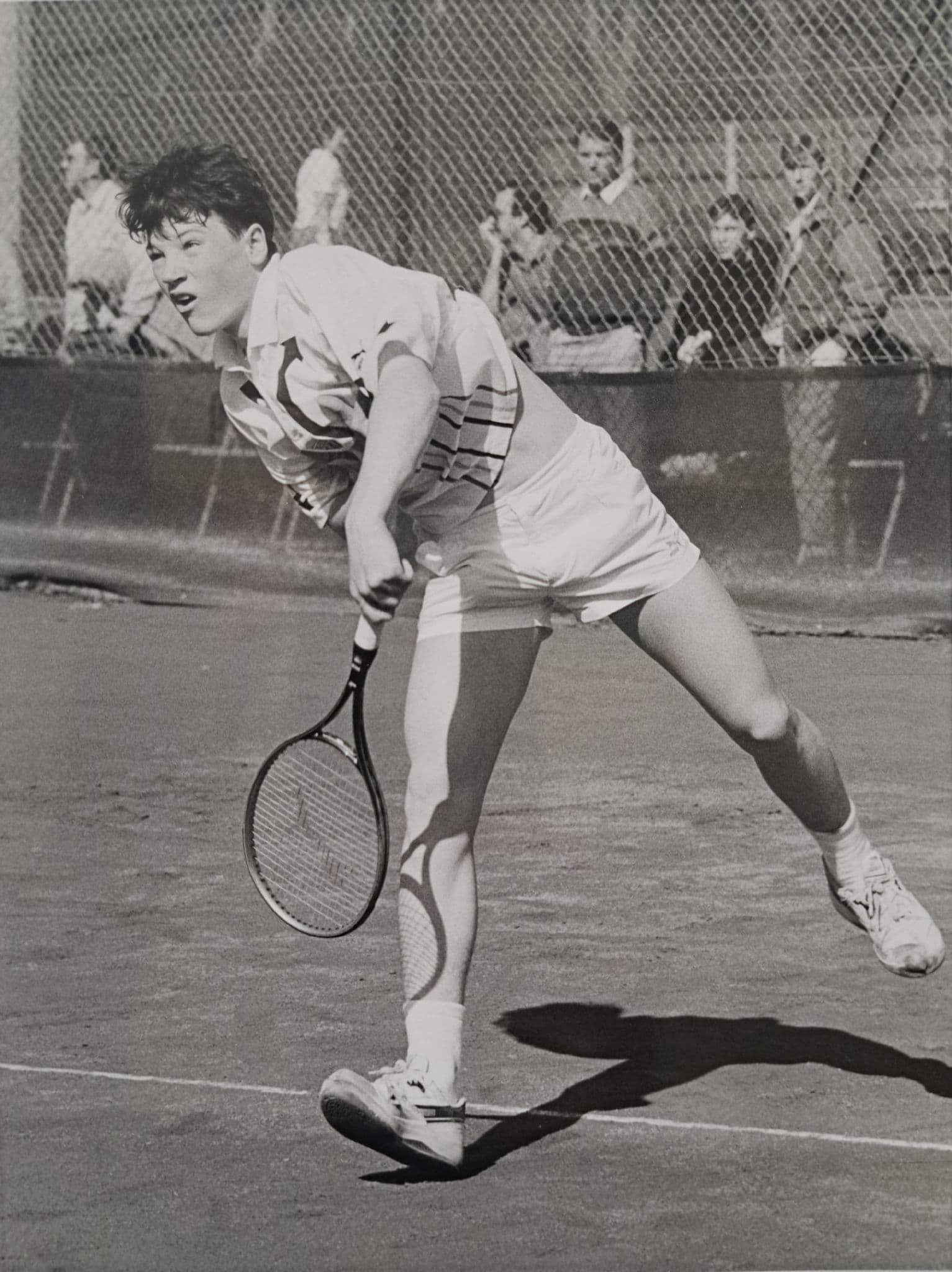 Press photo of Stuart Silvester, just finishing his service motion; 16cm by 21cm; portrait; photograph by Bob Thomas