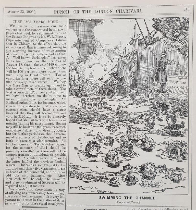 Swimming cartoon by Harry Rountree - who was a Punch artist from 1905 to 1939; one-third page cartoon from August 23rd 1905. 12cm by 18cm. Would look excellent framed ..... The Racketeer knows as he already has a number of these in the study! Might also appeal to the Europhile ..... as well as lovers of swimming