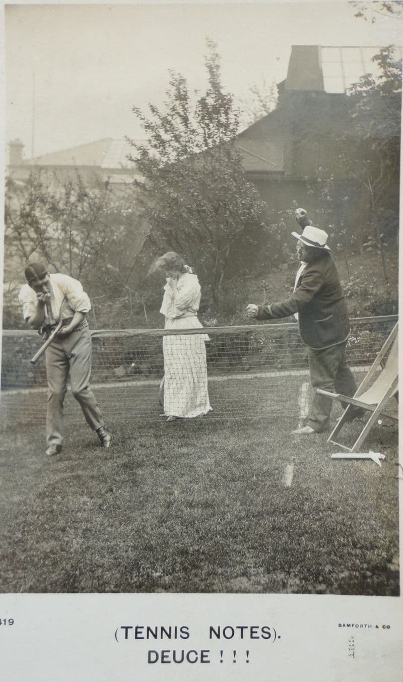 Un-used post card, showing a very angry umpire (or father!), remonstrating with a male and female tennis player; approximately 9cm by 14cm; in good condition; produced by Bamforth & Co of Holmfirth (who were also famous for their risque seaside postcards .....!!!)