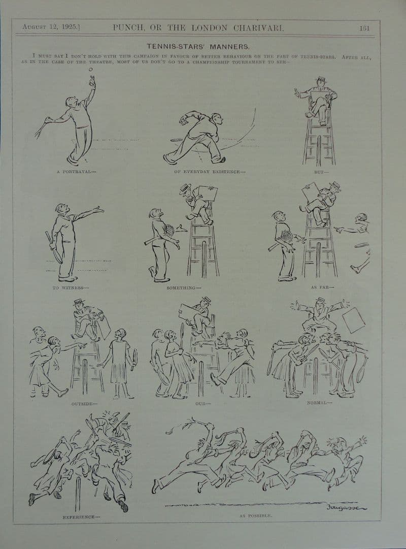 Punch tennis cartoon from August 12th, 1925; approximately 18cm x 24cm; drawn by the famous cartoonist Fougasse (CK Bird CBE), in addition to a long and illustrious career as an illustrator for the renowned periodical Punch, and work for the War Office - would make an ideal addition to the wall of any drawing or billiard room