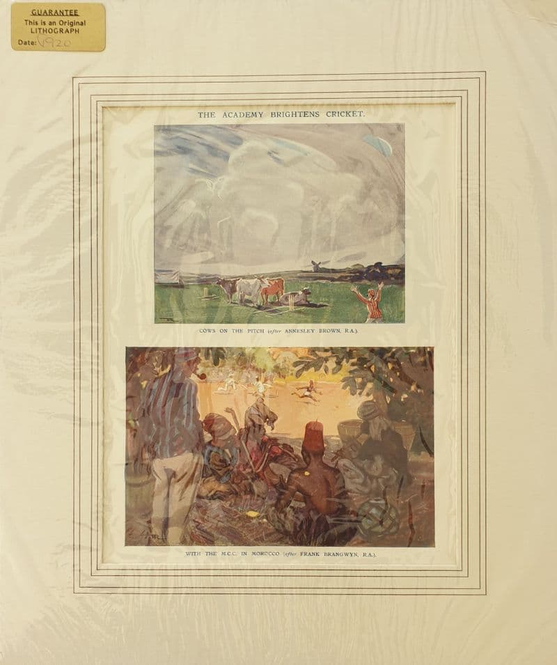Cricket cartoon by Frank Reynolds - one of a series of "The Academy Brightens Cricket"; he contributed extensively to Punch from 1906. Already comes with mount and border ready for framing; c.31cm by 37cm - image is 24.5cm by 19cm