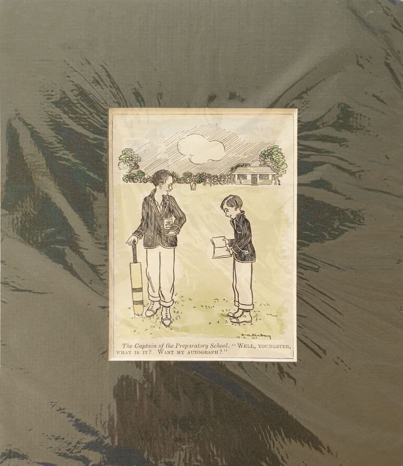 Coloured cricket cartoon by Halliday (?). Already comes with mount and border ready for framing; 18cm by 21cm - image is 11cm by 8.5cm