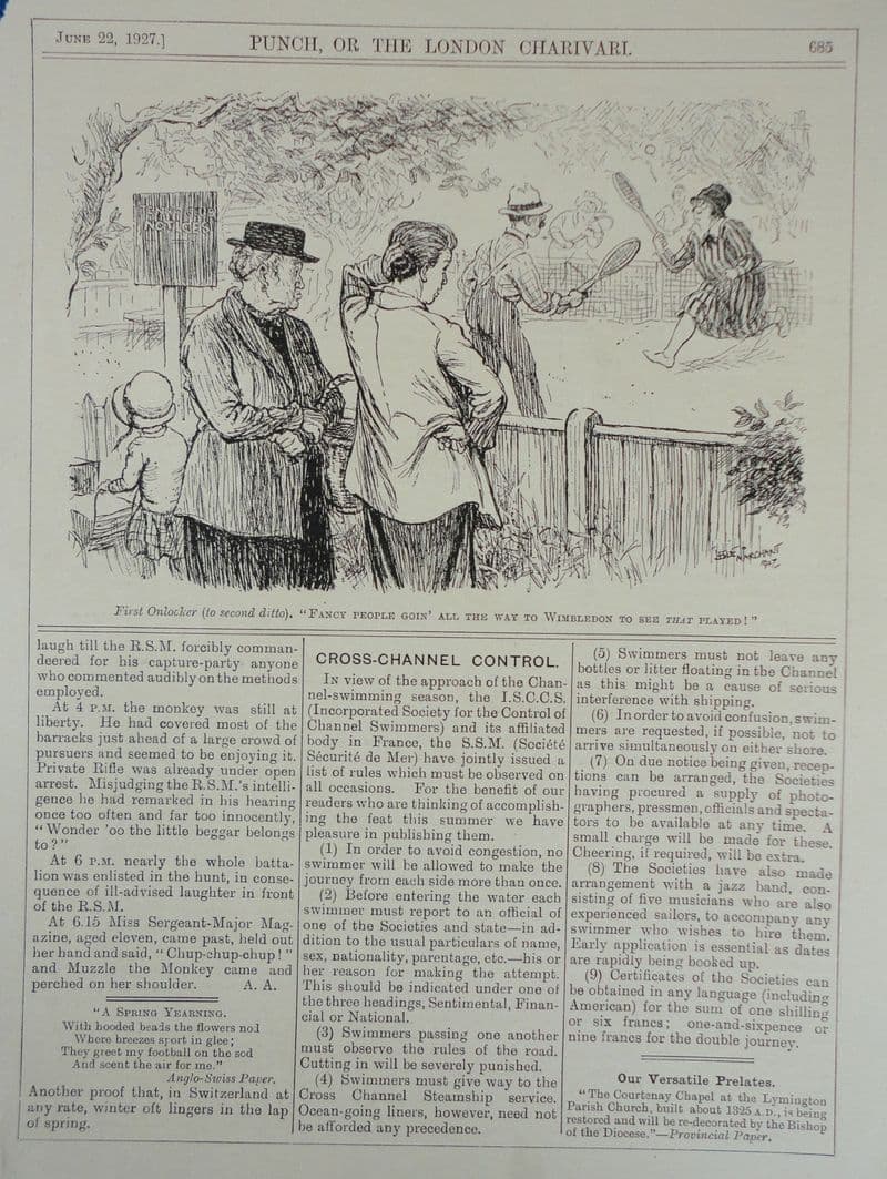 Tennis cartoon by Leslie Marchant, the little-known Punch illustrator; black and white, half-page cartoon from June 22nd, 1927. Measures approximately 18cm by 12cm