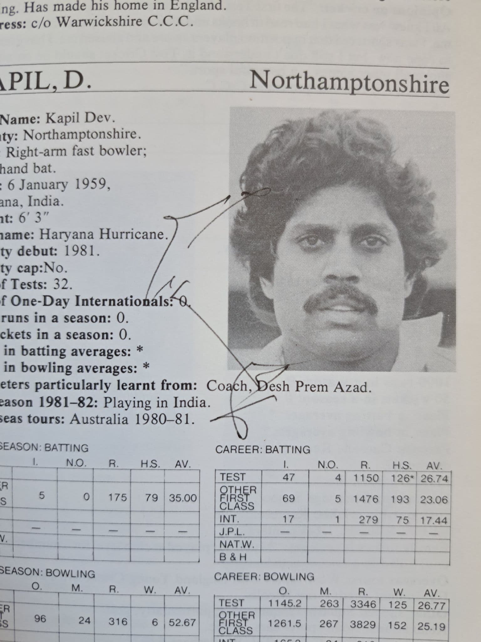 Published by Cricketer's Who's Who Ltd in 1982; soft cover in good condition - with slight rubbing to the edges / corners; 462 pages; compiled and edited by Iain Sproat MP; biographies and pictures of over 300 Test and County players; an introduction by Ian Botham; this copy contains the signatures of 30+ players (with each signature sitting over their picture / info) - players include Botham, Emburey, Gooch, Kapil Dev, Russell and Woolmer