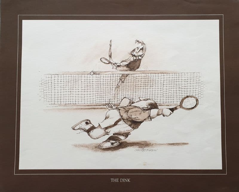 Cartoon print by the renowned American artist Gary Patterson; overall size is 51cm by 41cm - image is approximately 42cm by 32cm; landscape; brown border with cream edging and writing; titled "The Dink"; in good condition.
