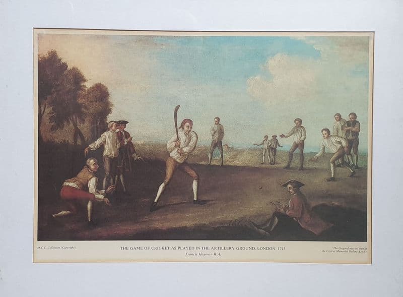 Coloured print showing a game of cricket at the Artillery Ground, London in 1743 - the original was by Francis Hayman R.A.; image is approximately 40cm by 28cm, with white border and black frame around that