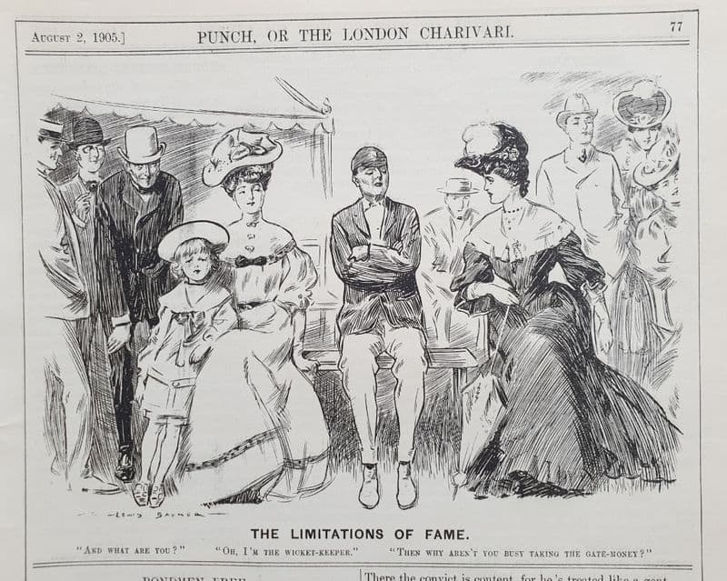 Cricket cartoon by Lewis Baumer, who illustrated for Punch for fifty years from 1897; black and white, half-page cartoon from August 2, 1905 - shows the trials of being a wicket-keeper of the time. Would look excellent framed ..... The Racketeer knows as he already has a number of these in the study! Measures approximately 18cm by 14cm