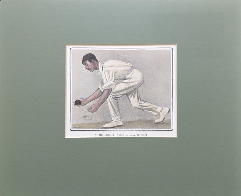 Hand-coloured SPY picture (possibly from a book or magazine), which shows Digby Jephson with ball in hand (ready to bowl one of his famous "lobs"); comes with green backing and mount ready for framing; border is about 23cm by 28cm, with the image 15.5cm by 9.5cm