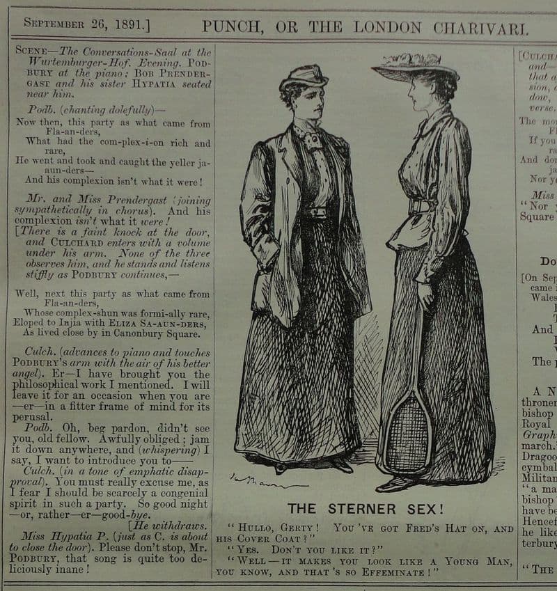Cartoon by an unknown artist (the signature is a little difficult to decipher!), and taken from Punch Magazine (or The London Charivari) on September 26, 1891; black and white; image is approximately 8cm by 14cm; an insight into outfits of the day, by a heavily-dressed tennis-player of the day!