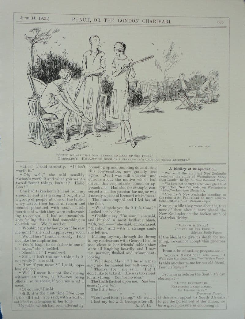 Tennis cartoon by Lewis Baumer, who was a prolific book and Punch illustrator from the 1890s to the 1930s; black and white, half-page cartoon from June 11th, 1924. Measures approximately 18cm by 11.5cm