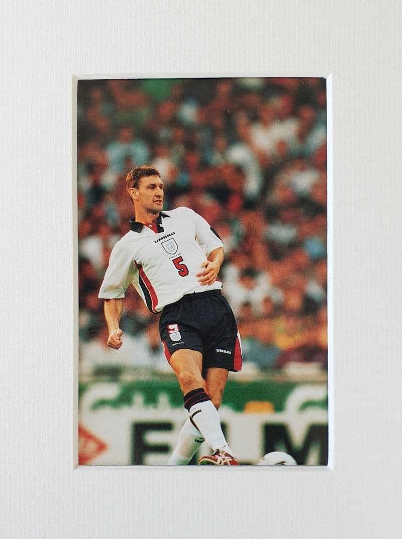 England football postcard; 15cm by 10cm; portrait; writing to the rear says "c1998 All rights reserved"; comes with backing and mount ready for framing; this card shows Tony Adams hitting a typically cultured right-footed pass in the England home kit