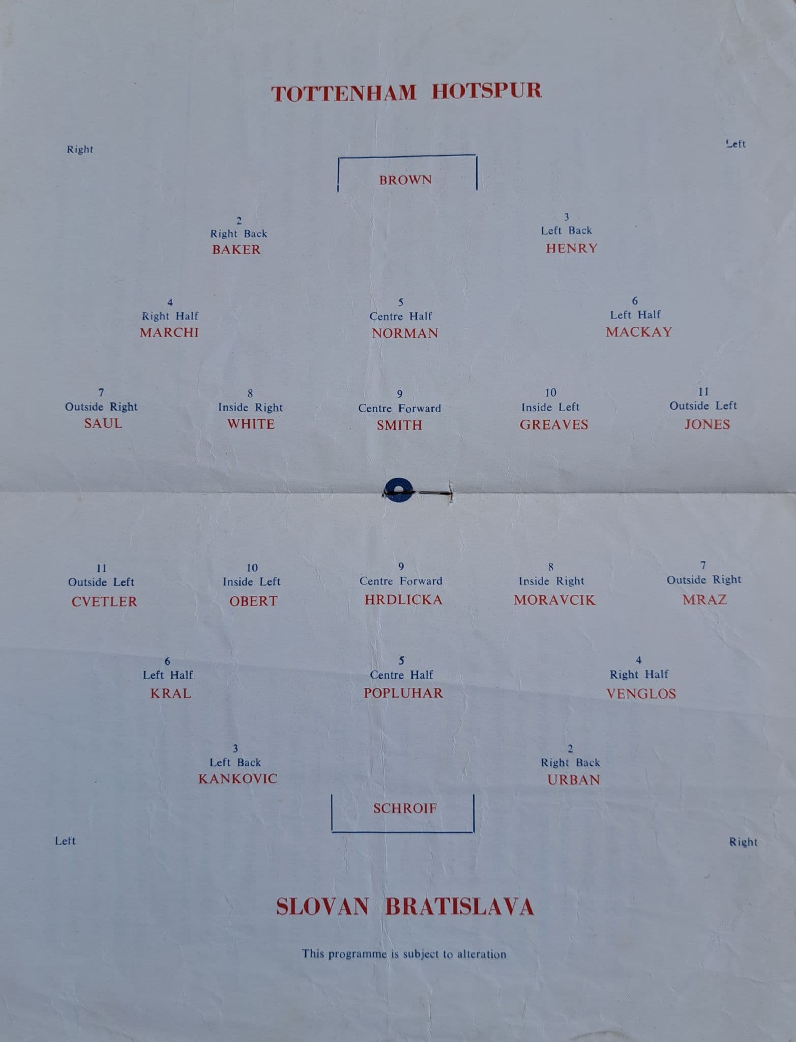 Programme from the European Cup Winners Cup QF, between Spurs and FC Slovan (of Bratislava) - match played on March, 14th, 1963; in fair condition with pocket fold / wear; pirate copy produced by Tuckett's of Colliers Wood