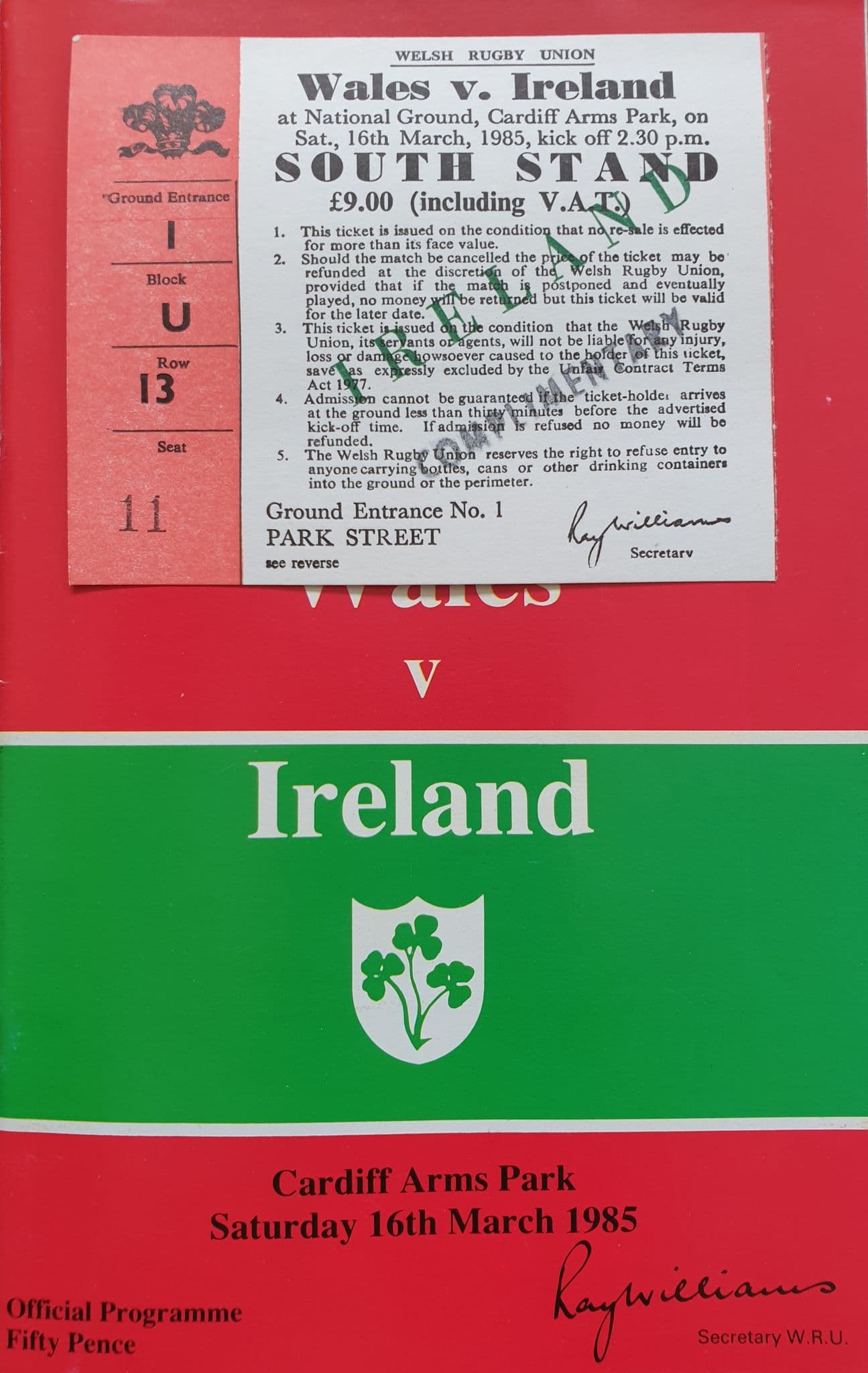 Programme for the Five Nations match match held between Wales and Ireland, played at Cardiff Arms Park on Saturday March 16th, 1983; programme is in good condition; also includes a ticket to the South Stand