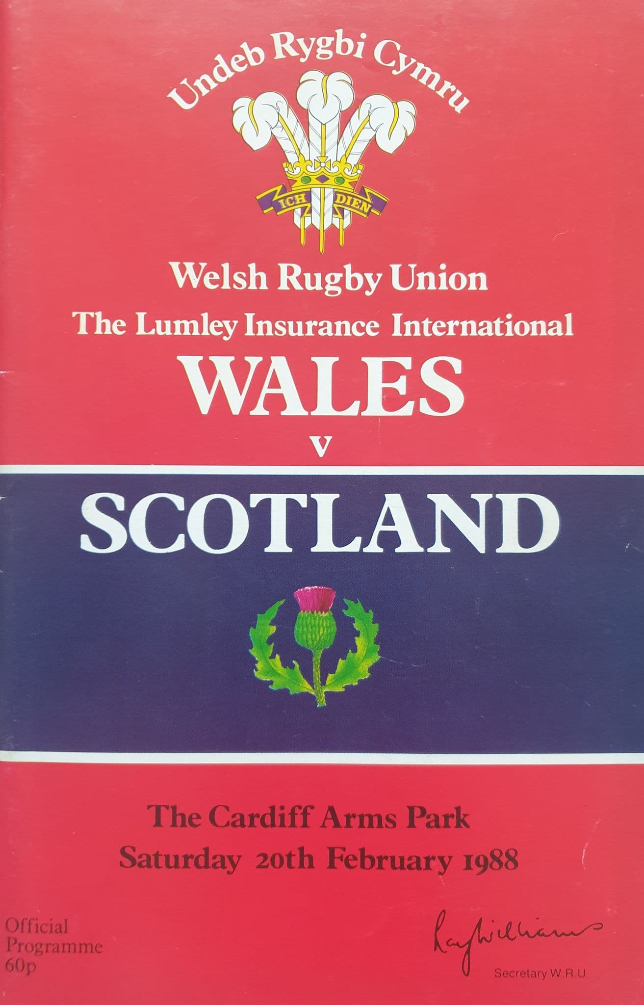 Programme for the Five Nations match held between Wales and Scotland, at Cardiff Arms Park on Saturday February 20th, 1988; programme is in good condition, with no writing; comes with a South Stand ticket; Wales won 25-20 on their way to a share of the title
