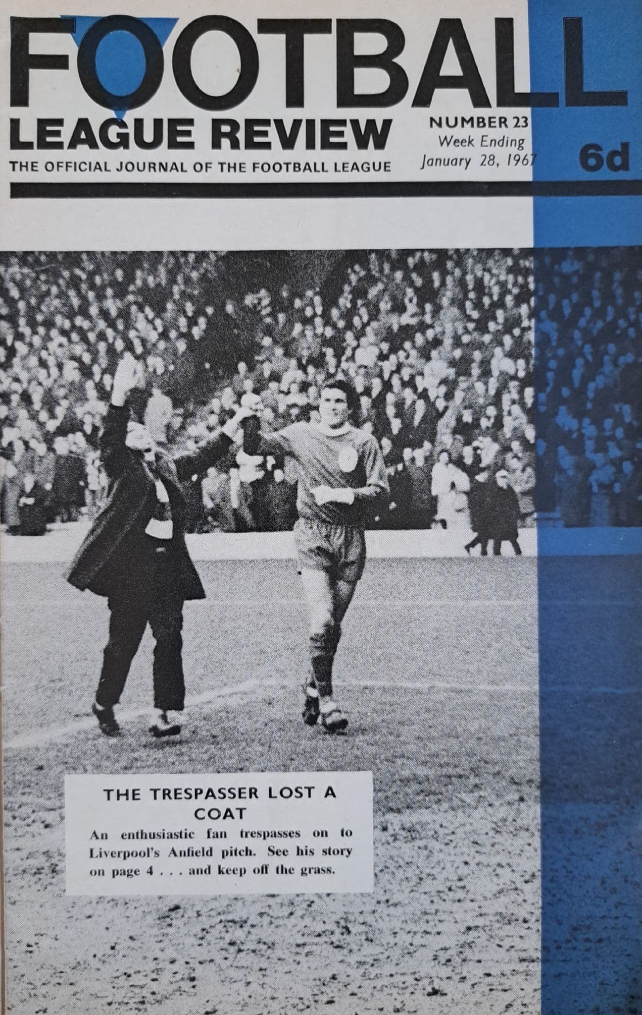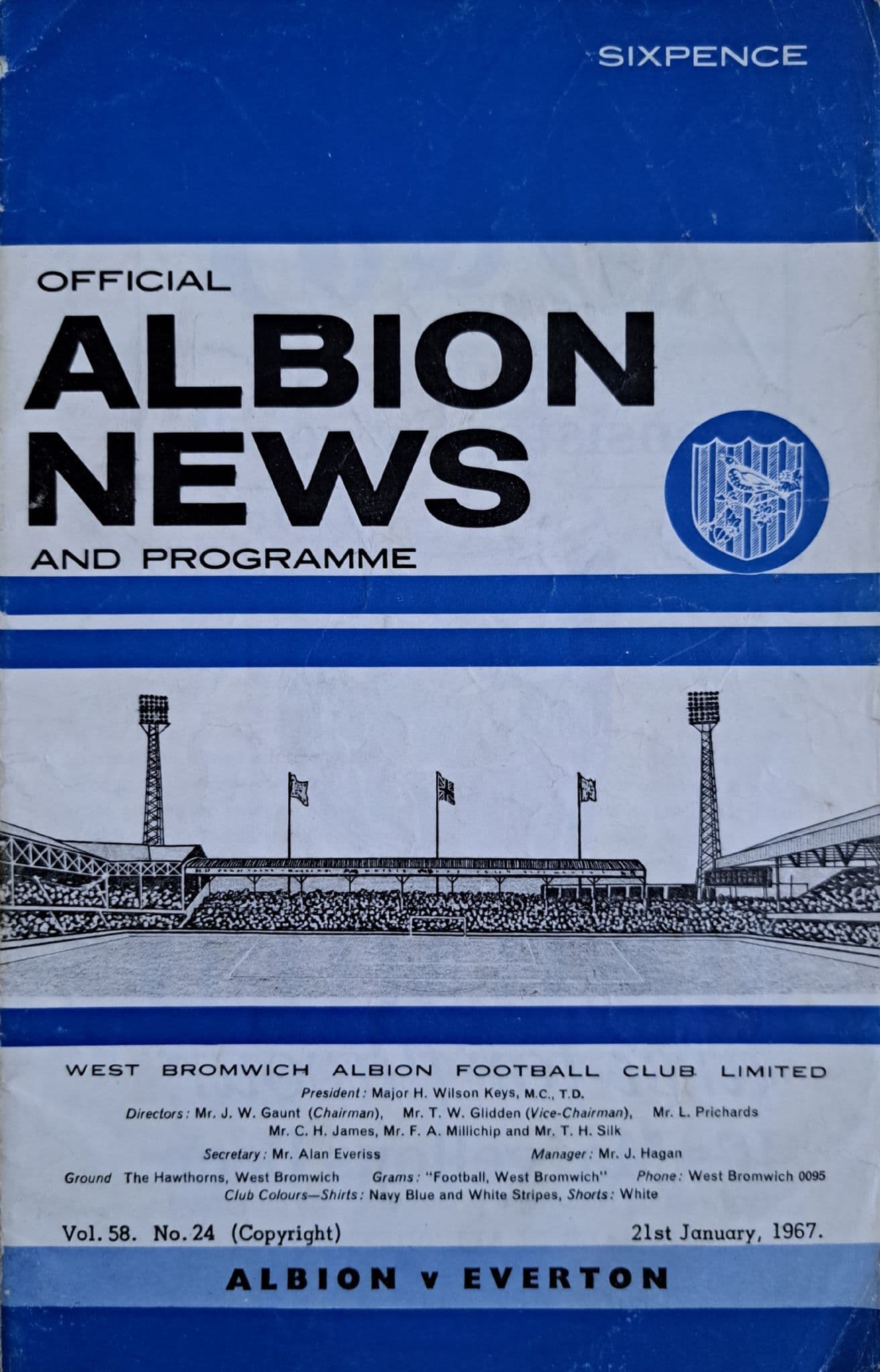 Programme from the Division 1 match which took place between the Baggies and Everton, on January 21st, 1967 at the Hawthorns; programme is in fairly good condition, with no writing but slight signs of wear to the corners; 12 pages; also includes the Football League Review (Issue 23)