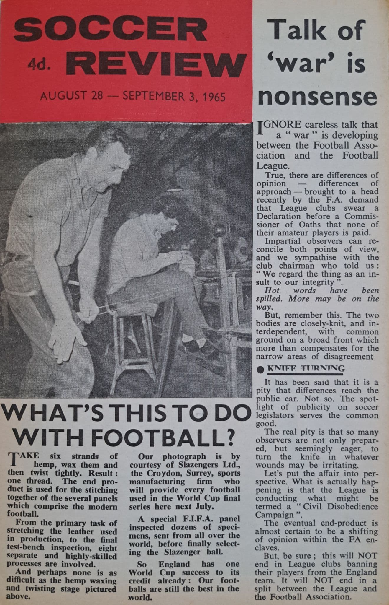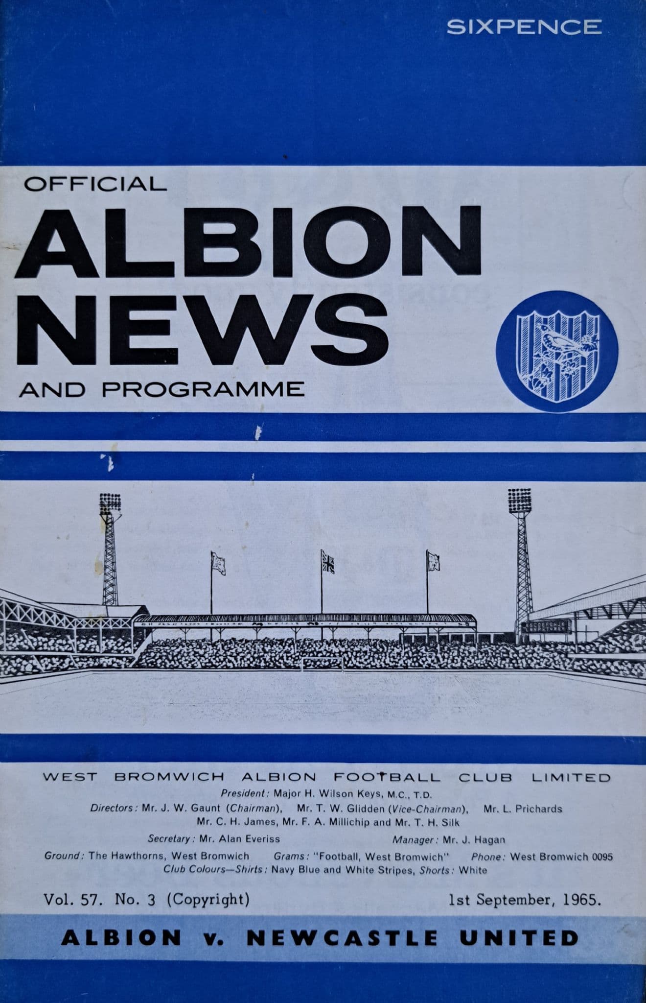 Programme from the Division 1 match which took place between the Baggies and Newcastle, on September 1st, 1965 at the Hawthorns; programme is in fairly good condition, with no writing but a slight vertical pocket fold; 12 pages; also includes Soccer Review (Aug 28 to Sep 3)