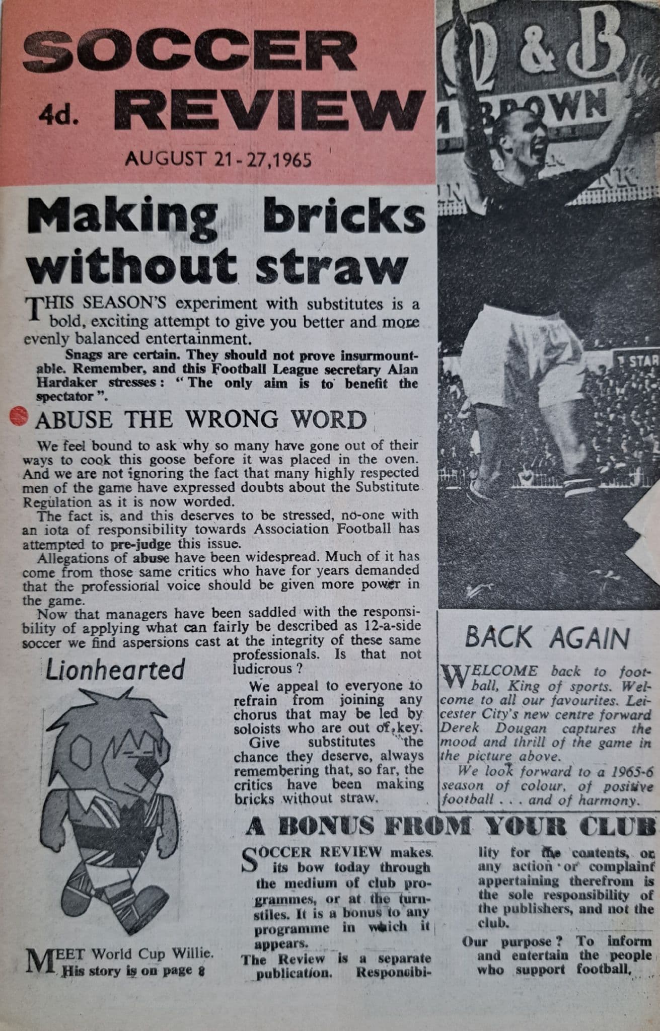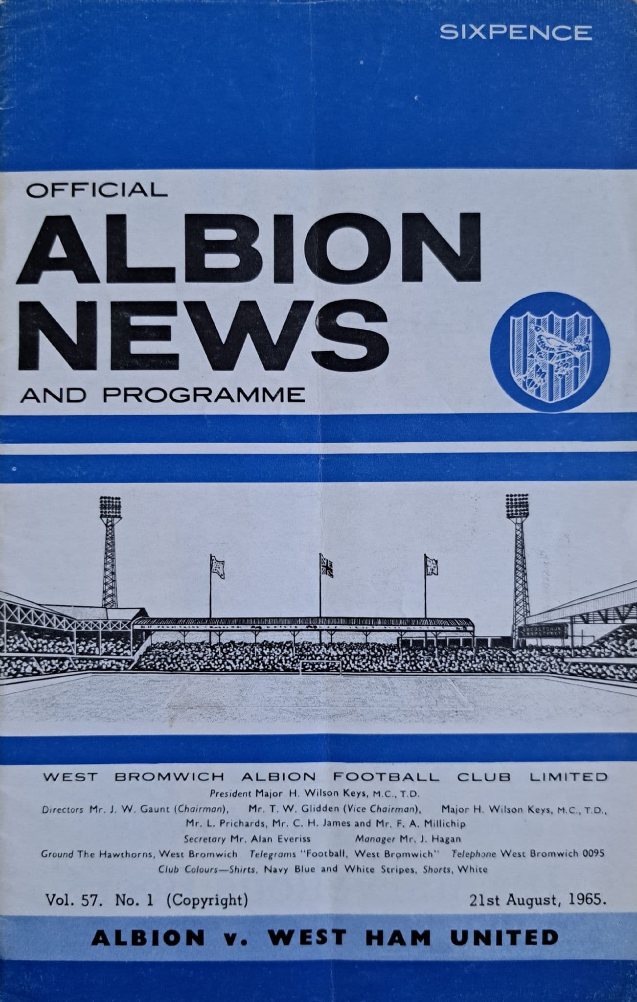 Programme from the Division 1 match which took place between the Baggies and West Ham, on August 21st at the Hawthorns; programme is in fairly good condition, with no writing but a vertical pocket fold; 12 pages; also includes Soccer Review (Aug 21-27)
