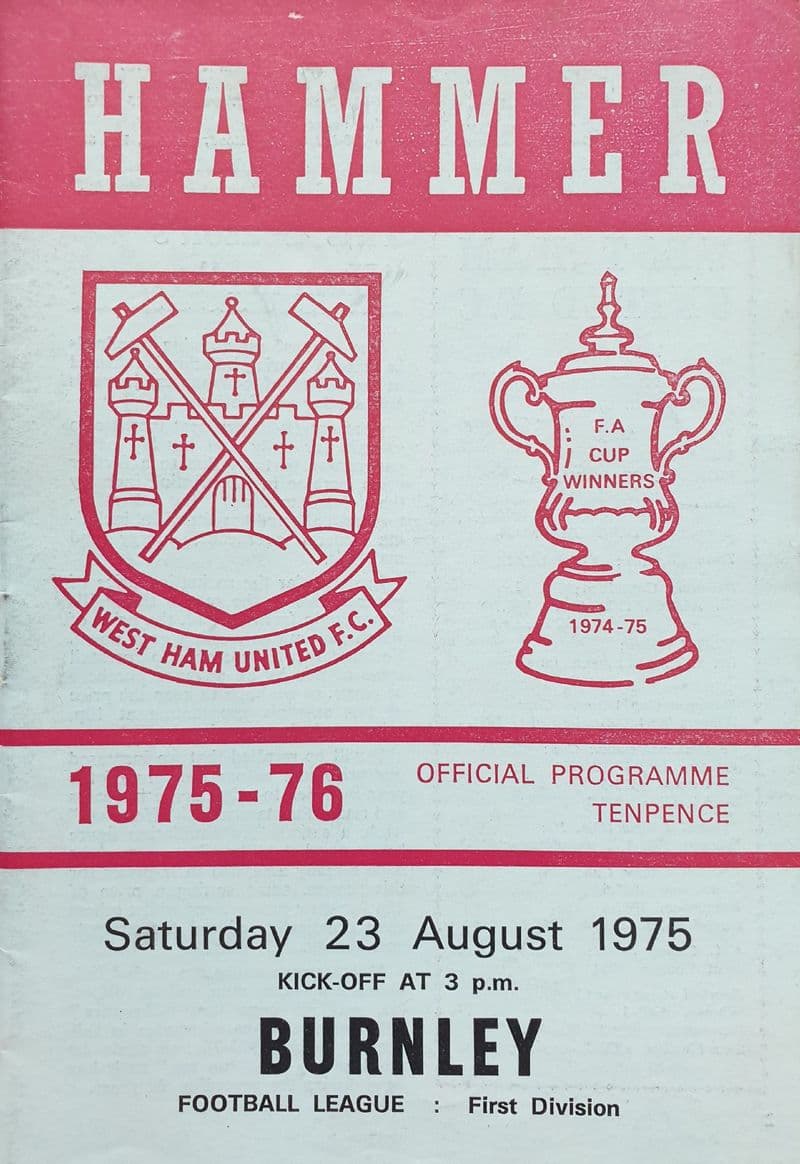 Programme from the Division One match between West Ham and Burnley; played at the Boleyn Ground on Saturday August 23rd, 1975; 20 pages; in good condition, with no writing or marking