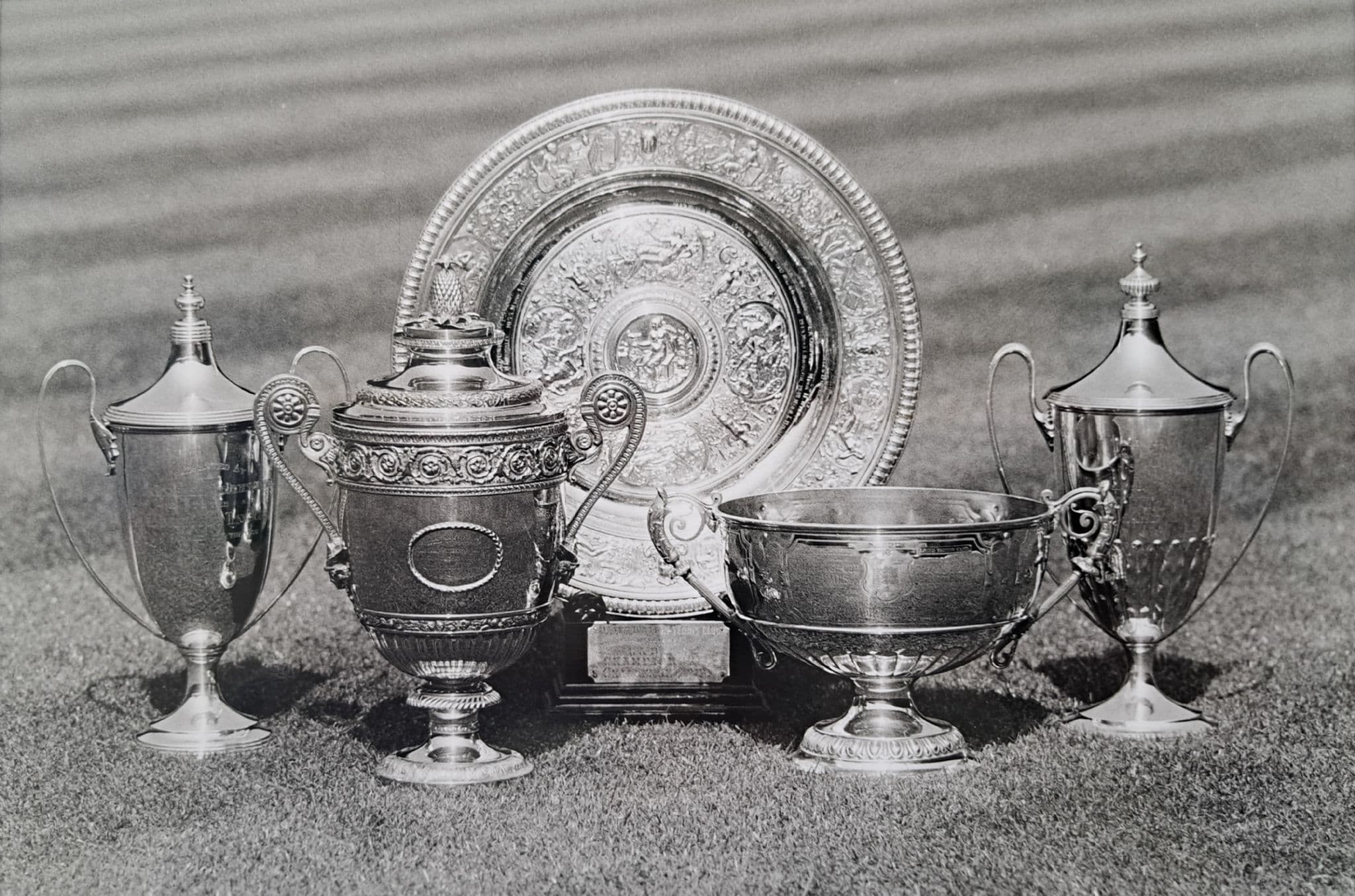 Black and white press photo showing the Wimbledon trophies, on the hallowed turf at SW19; 16.5cm by 24.5cm; landscape; photograph by Bob Thomas