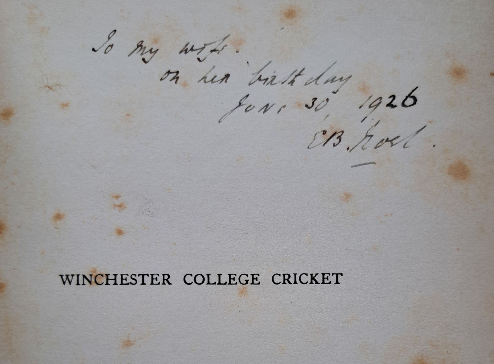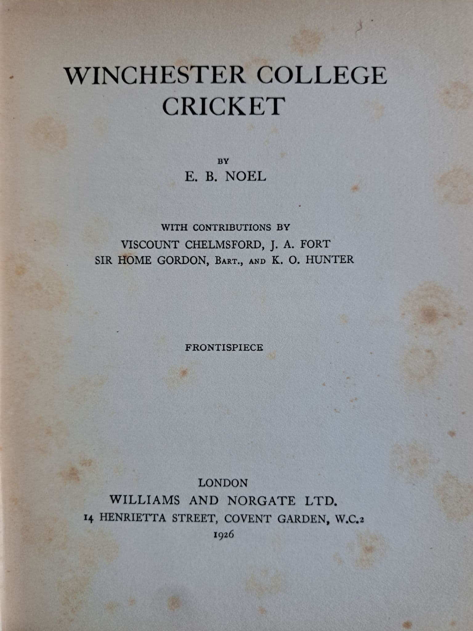 Published by Williams & Norgate in 1926; navy blue cloth cover, with gold-coloured writing; wear to edge corners, and at the the top and bottom of the spine; 250 pages; includes score cards / match summaries for all matches against Eton and Harrow from 1826 to 1925; signed by the author on the inside page "To my wife on her birthday, June 30 1926 E B Noel"