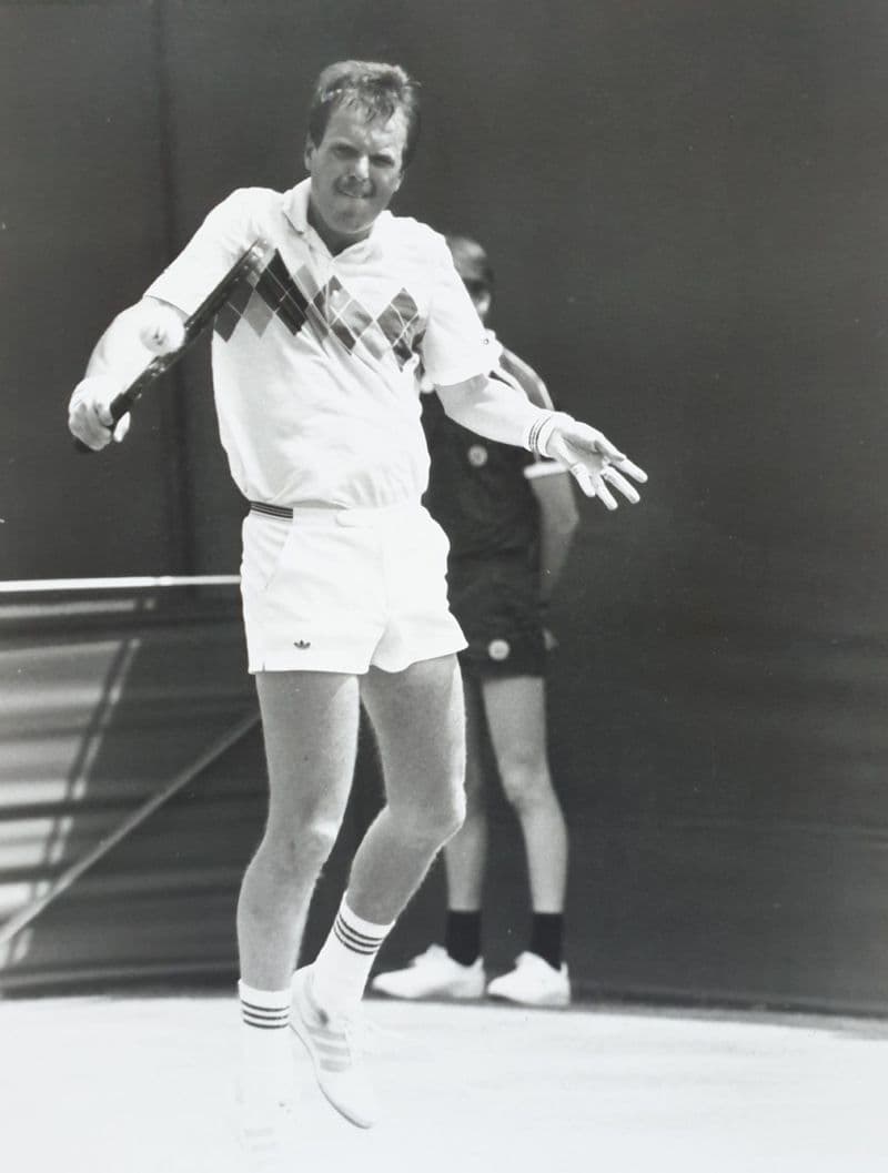 Black and white press photo from a recently acquired Tommy Hindley (Professional Sport) collection - though this one has no writing / stamp to the rear; showing Poland's Wojciech Fibak hitting a backhand; portrait; 16.5cm x 21.5cm