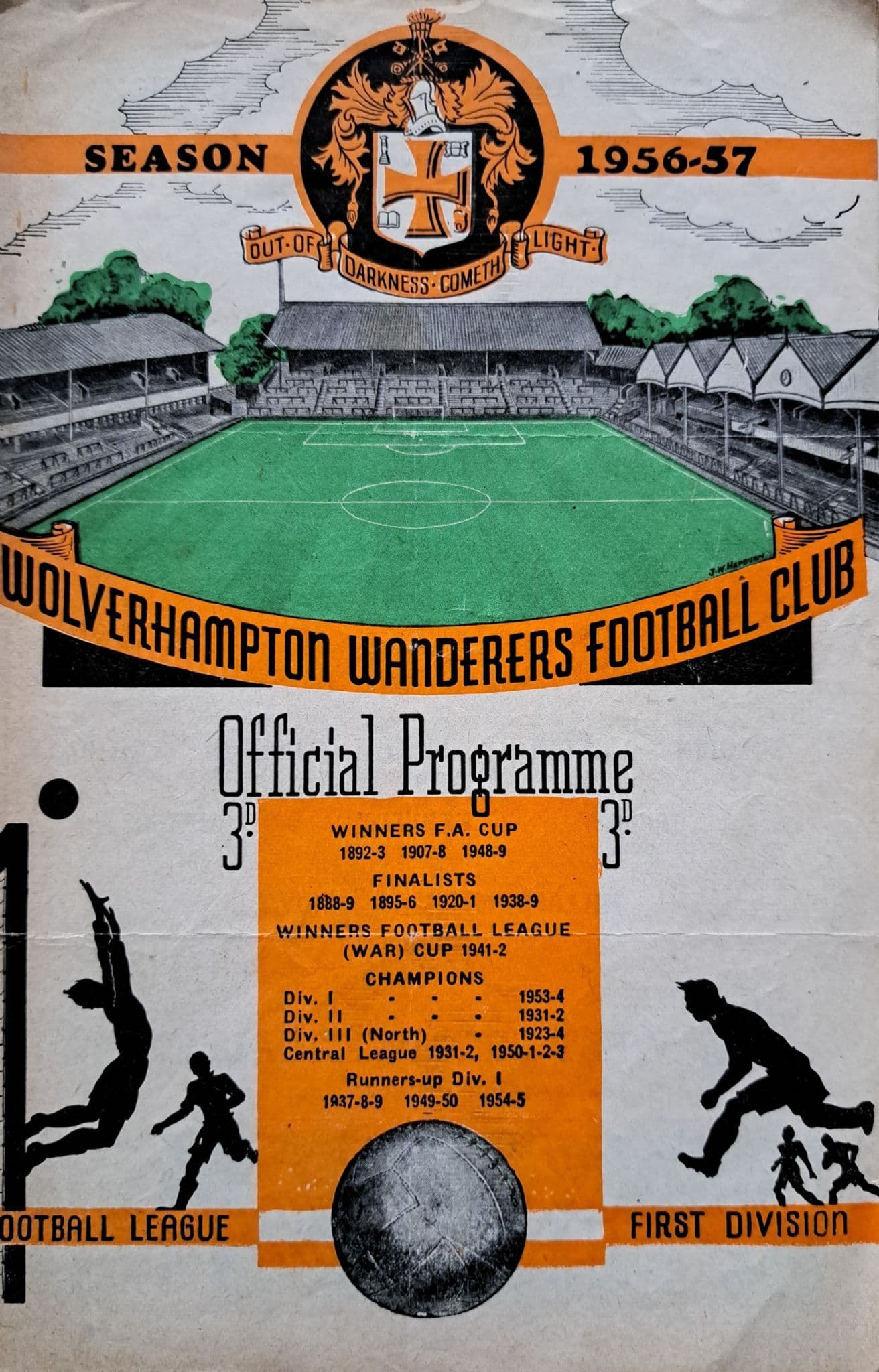 Programme from the Division 1 match between Wolves and West Bromwich Albion, at Molineux; played on Monday April 15th, 1957; in fair condition, with no writing but some signs of wear to the corners and a split above the top staple; 8 pages
