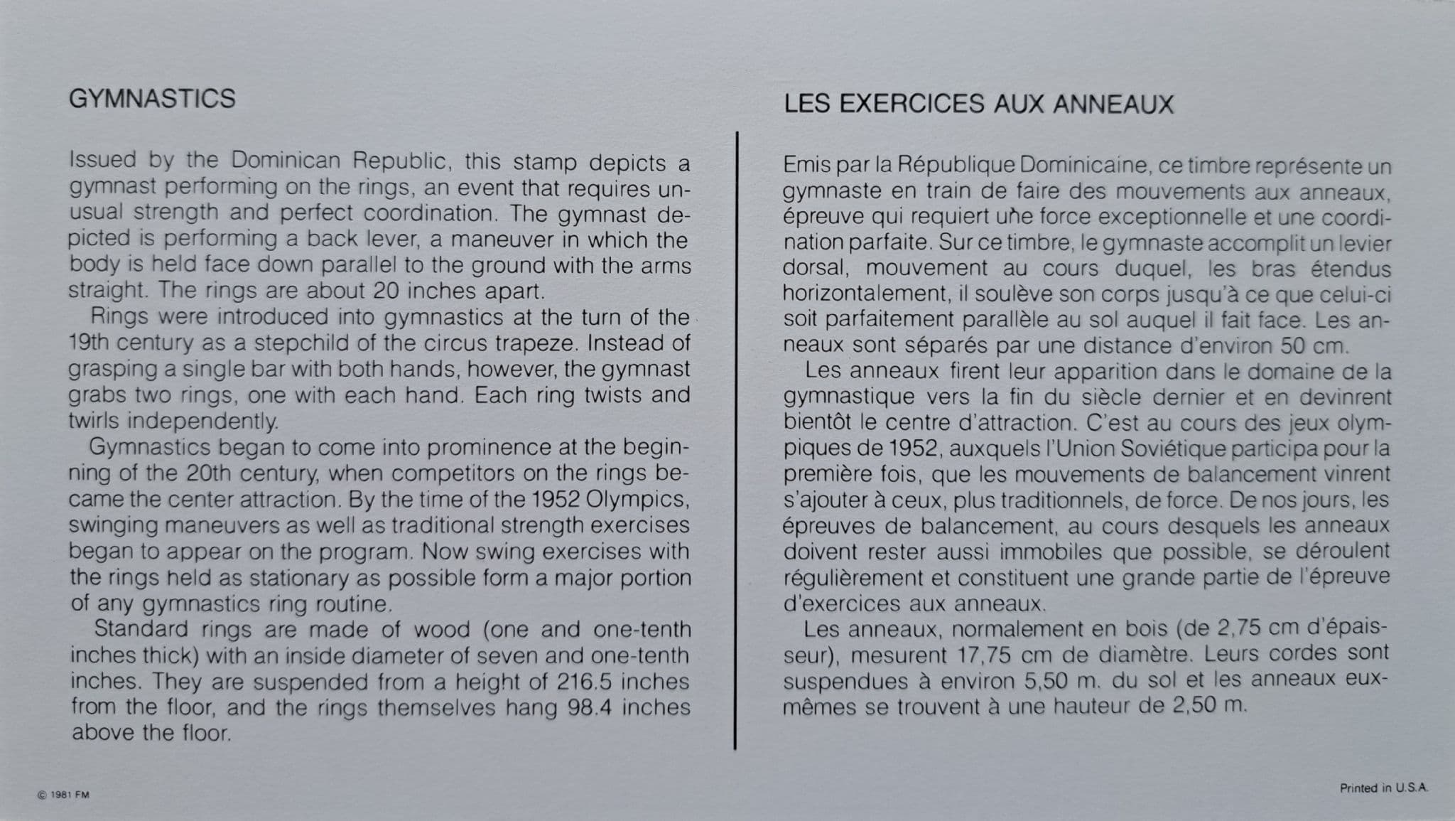 One of a large set of sporting cards - with a related stamp and custom artwork on each card; 20cm by 11.5cm; landscape; writing to the rear gives some information about the game and the stamp used; stamp produced by the Dominican Republic in 1981