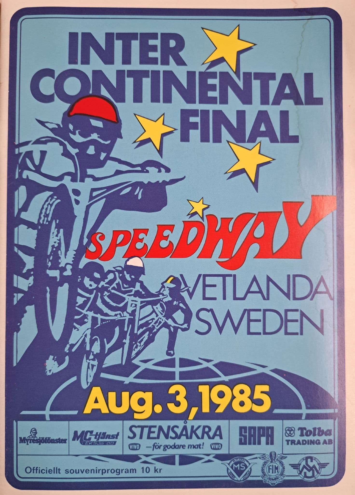 Programme from the World Speedway Championship Intercontinental Final; held in Vetlanda, Sweden on August 3rd, 1985; 36 pages; in good condition - with no results added, but a slight mark to the front cover